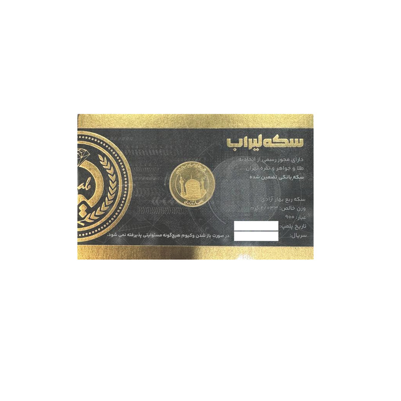 ربع سکه طلا بهار آزادی طرح جدید ضرب این سکه از سال 1404 به بعد می باشد و مناسب سرمایه گذاری و قابل خرید و فروش در کلیه سکه فروشی های معتبر در سراسر کشور می باشد